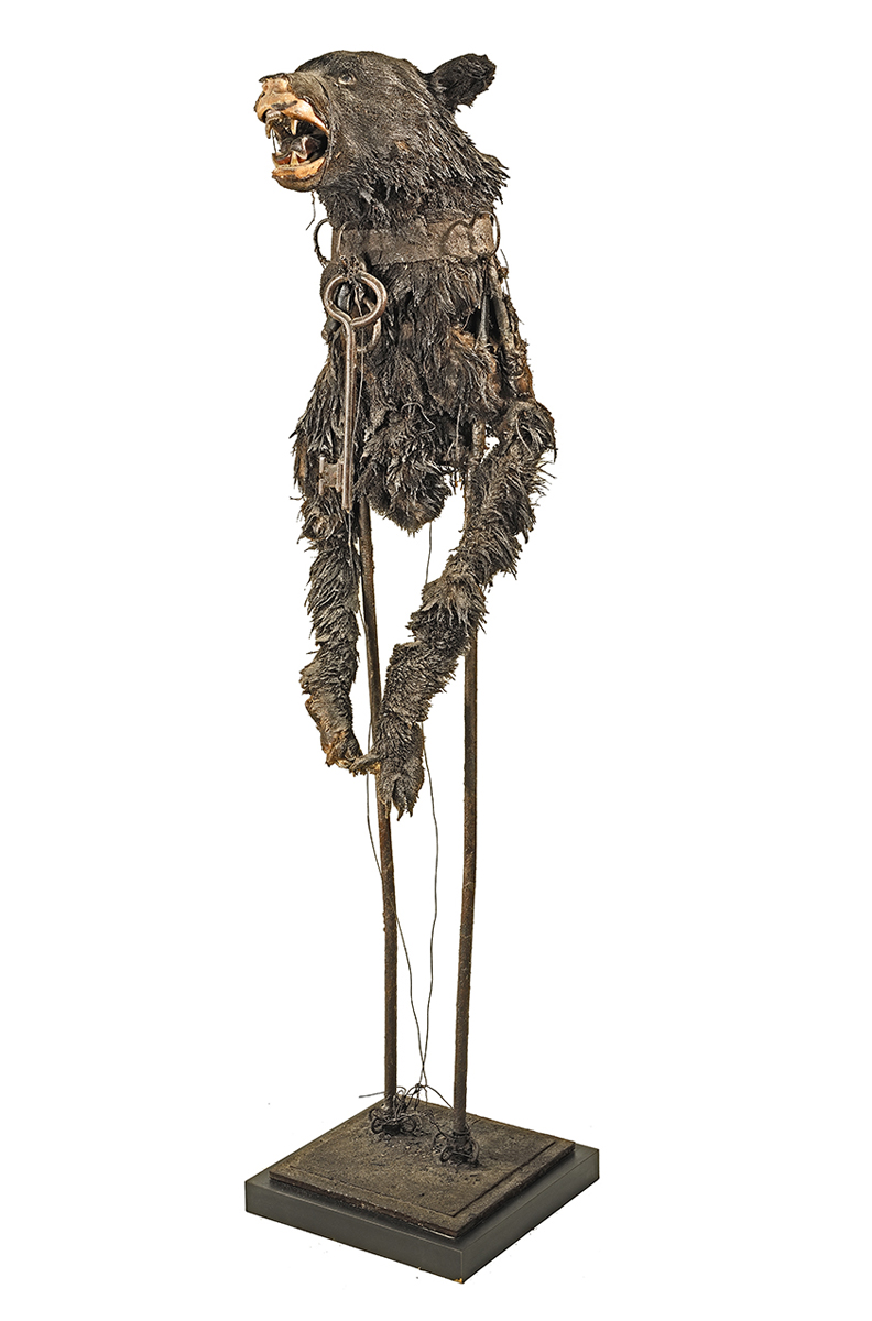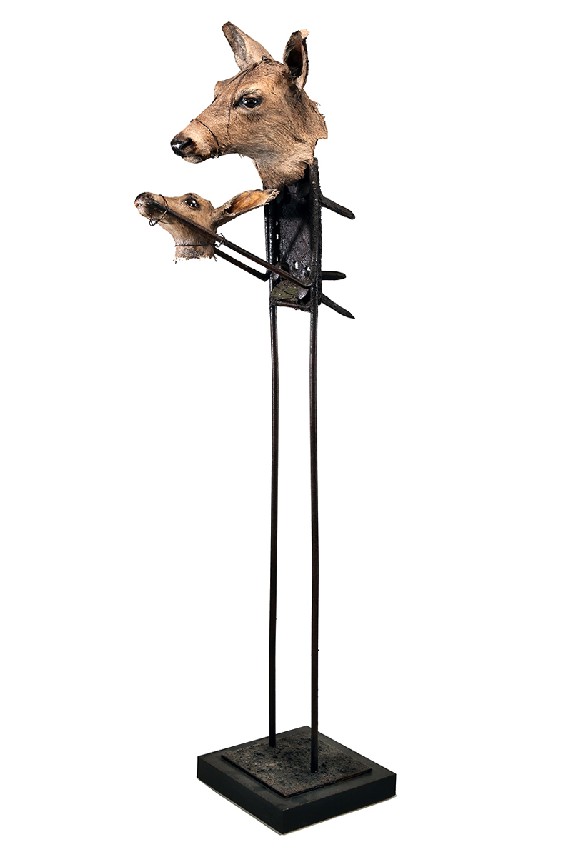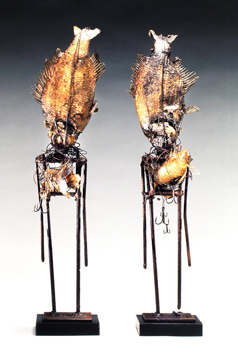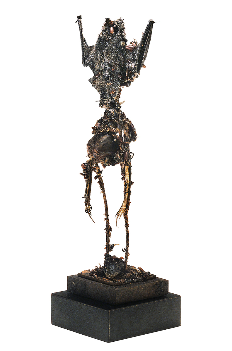 (Materials: manipulated found materials, wax and wire over welded steel)