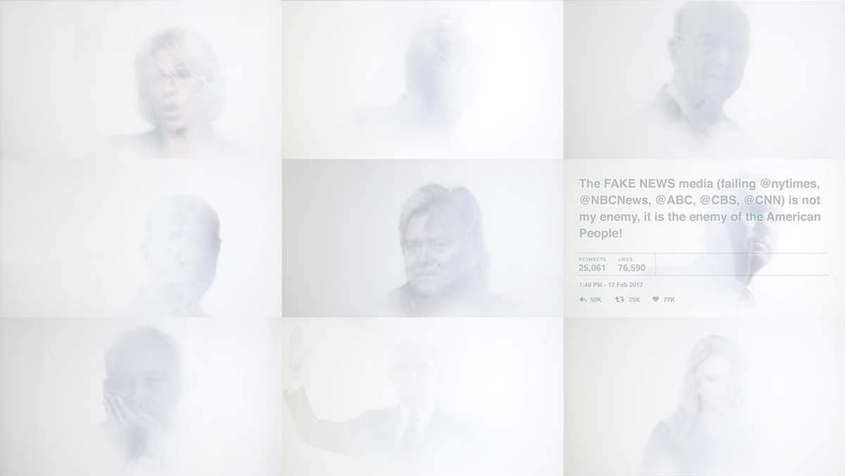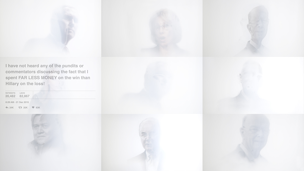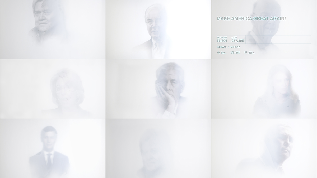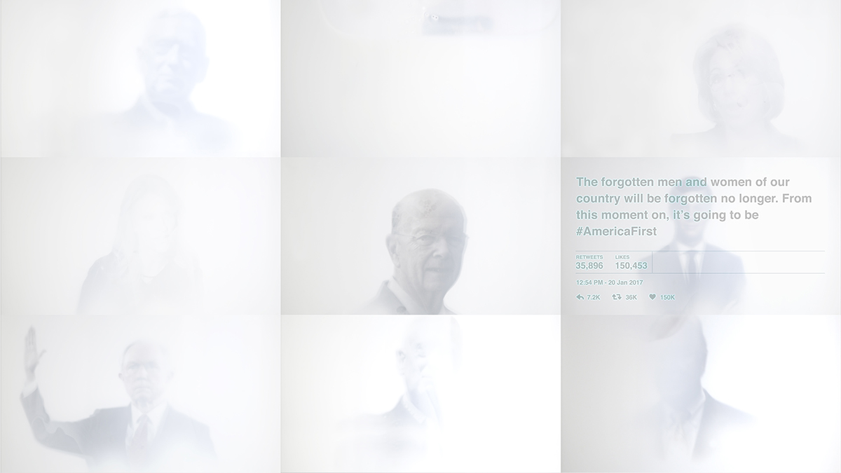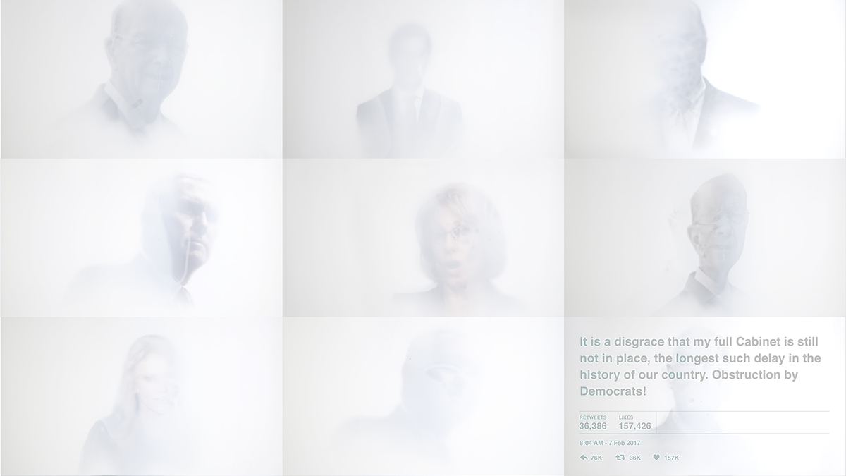 The original members of Donald Trump’s cabinet were the least diverse of any modern presidency. For this piece, portraits of the cabinet were bathed in milk and recorded as they emerge and recede into whiteness. Individual frames of the moving image are isolated and displayed as a grid. As the viewer engages with the work, their motion triggers a series of randomized tweets by President Trump that superimpose over the imagery. The generative nature of the imagery and text responds to the tumult of the administration and its rhetoric of exclusion.