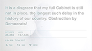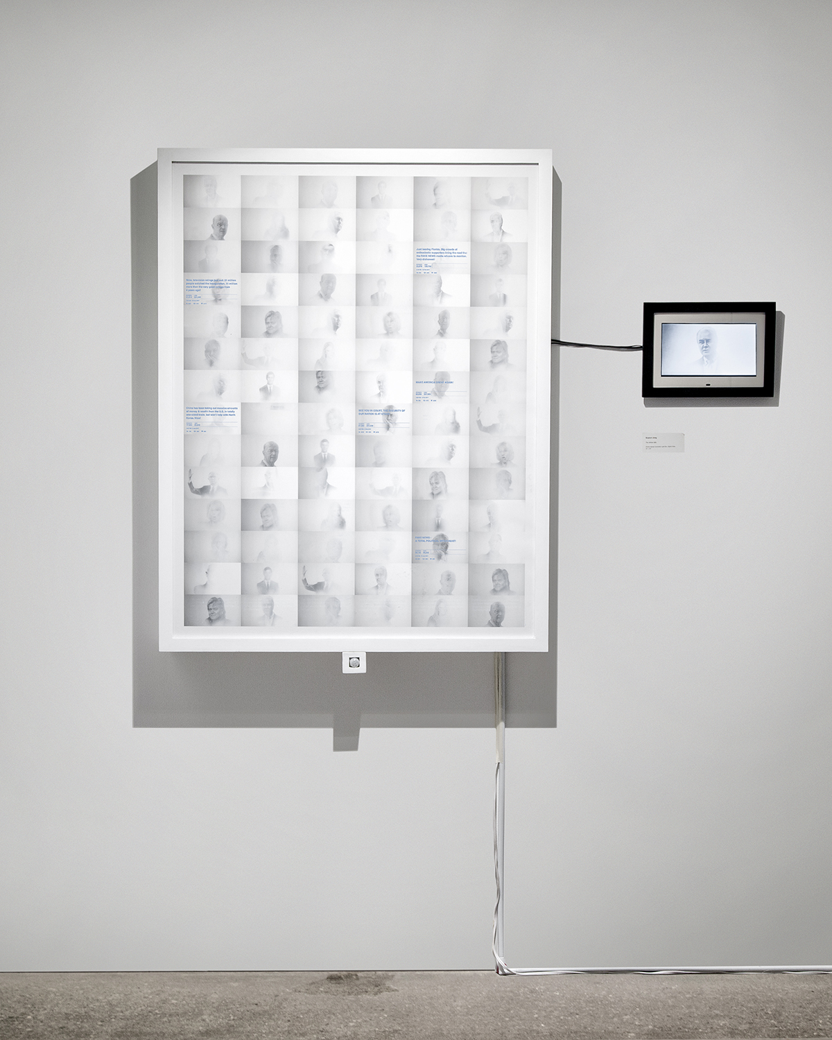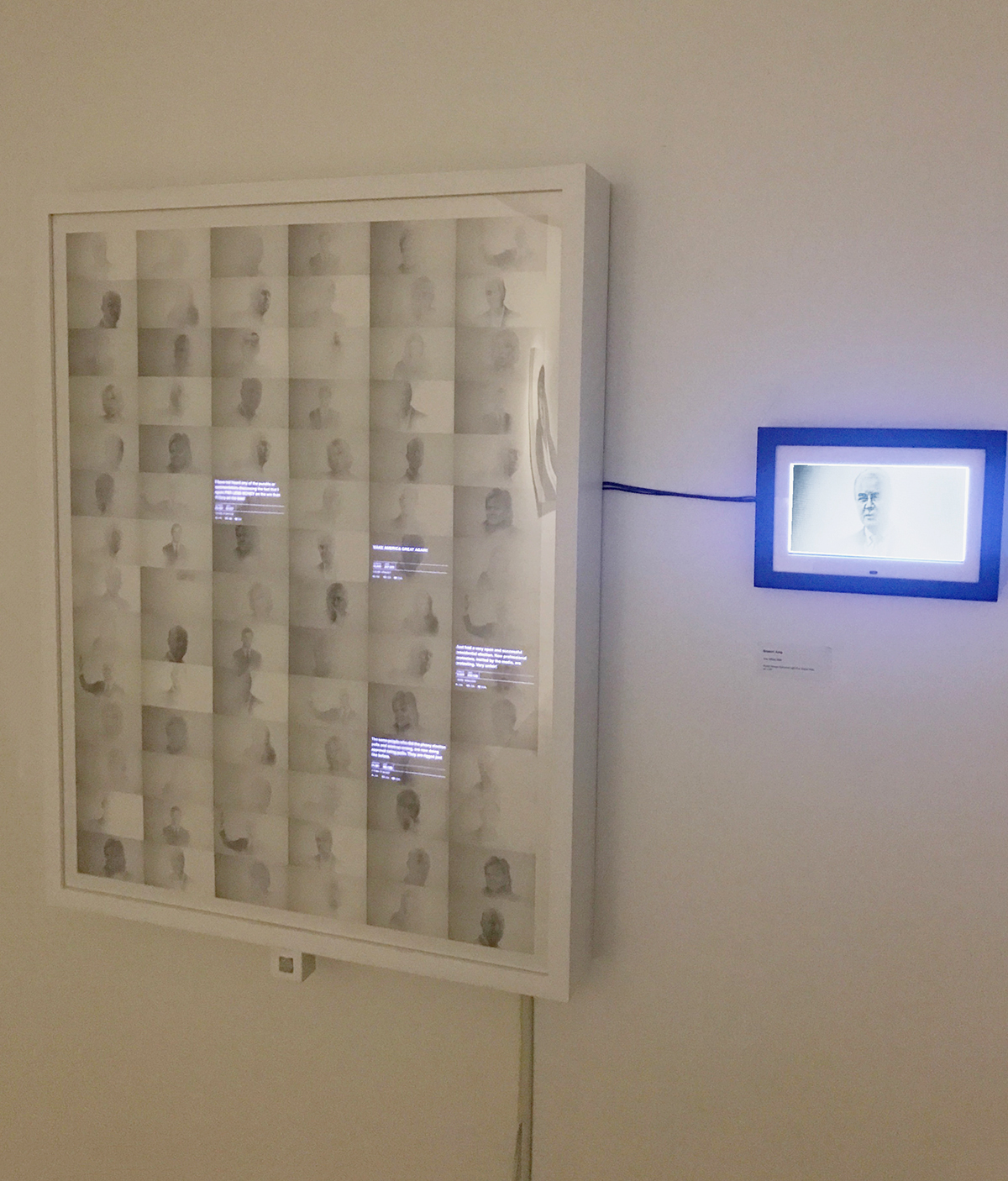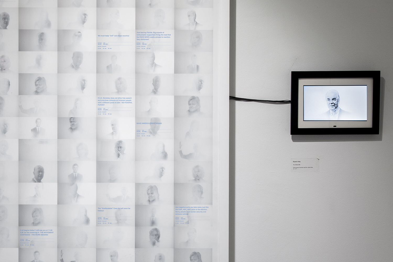 The original members of Donald Trump’s cabinet were the least diverse of any modern presidency. For this piece, portraits of the cabinet were bathed in milk and recorded as they emerge and recede into whiteness. Individual frames of the moving image are isolated and displayed as a grid. As the viewer engages with the work, their motion triggers a series of randomized tweets by President Trump that superimpose over the imagery. The generative nature of the imagery and text responds to the tumult of the administration and its rhetoric of exclusion.