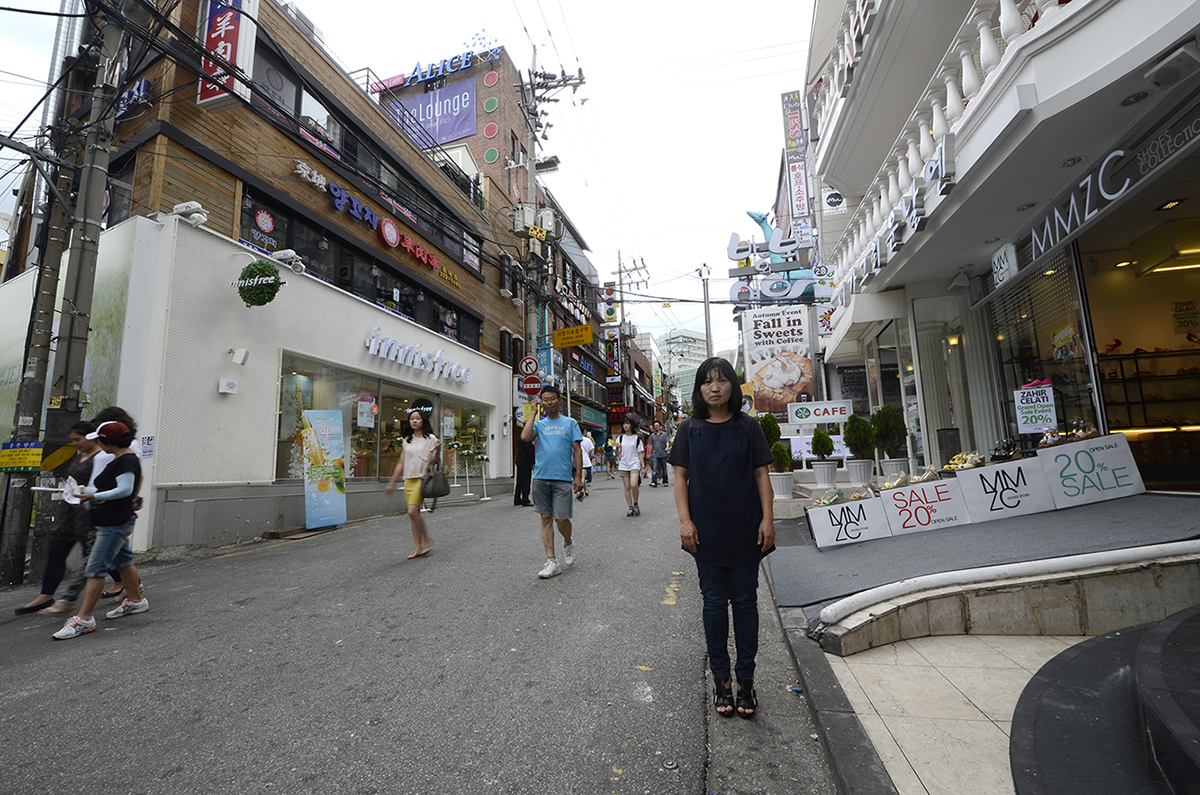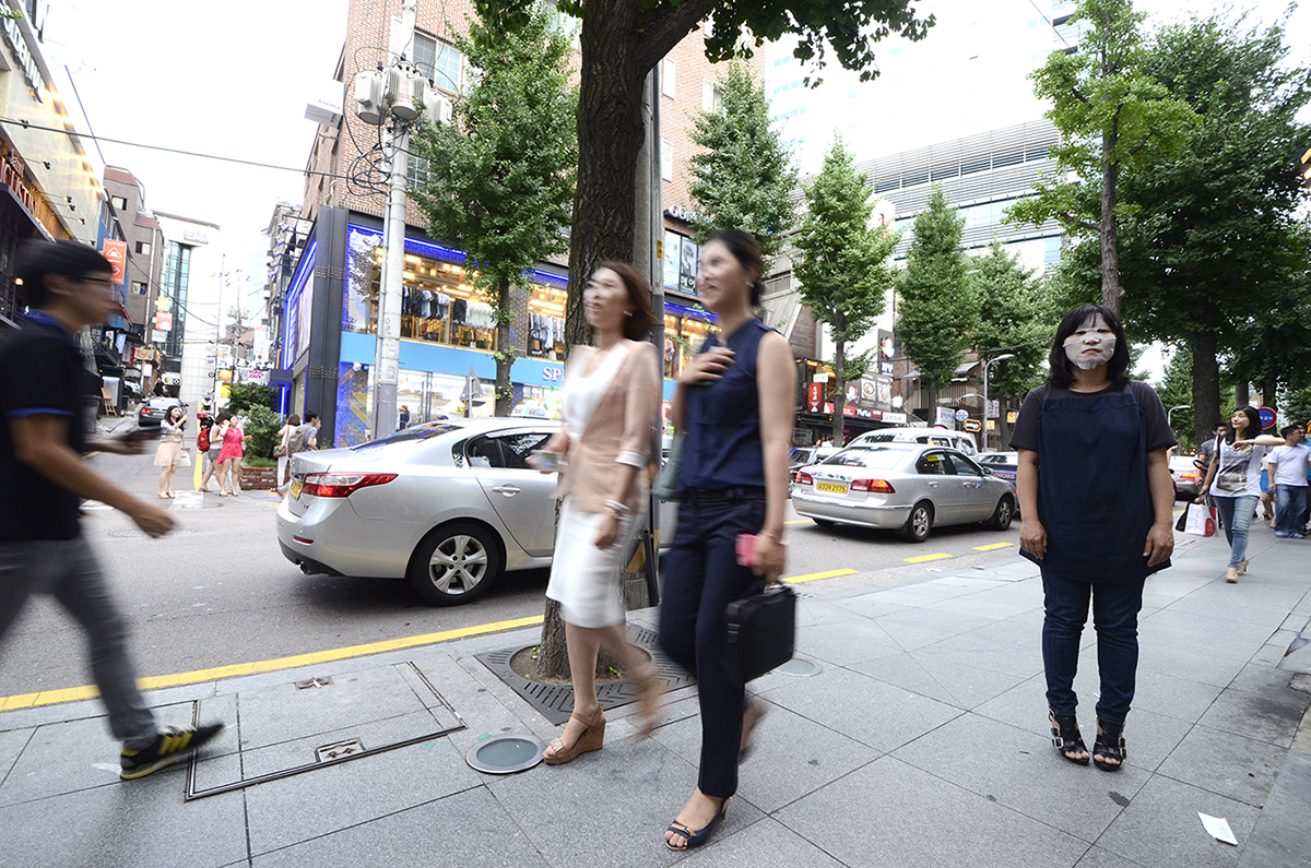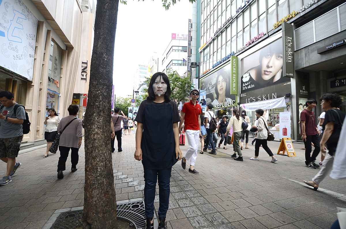 The Cover(ed) Girl confronts Korea’s cultural obsession with the appearance of the female body. From cosmetics, to plastic surgery, to K-Pop, the standard of beauty in Korea is becoming increasingly regimented and homogenized. In this series of performances, I appeared in public, in the most trending areas of Seoul, wearing the cosmetic facial masks popular amongst Korean women. The appearance of a masked woman brought one of the private rituals of beauty practiced by women into the public sphere, while the surreal anonymity of the mask created a subtle insertion that sought to disrupt the media’s representations of the female body.