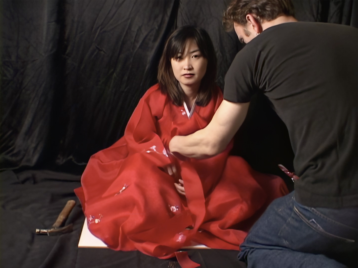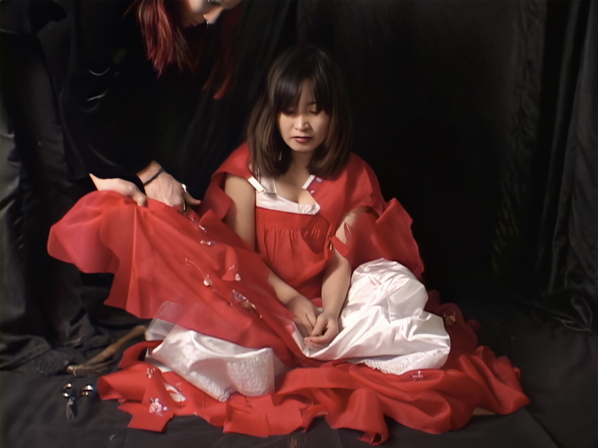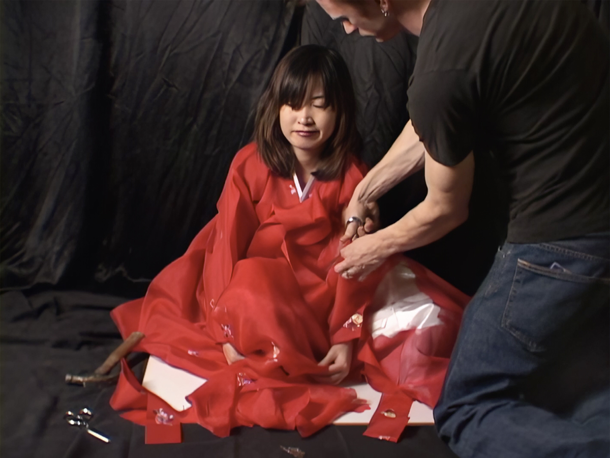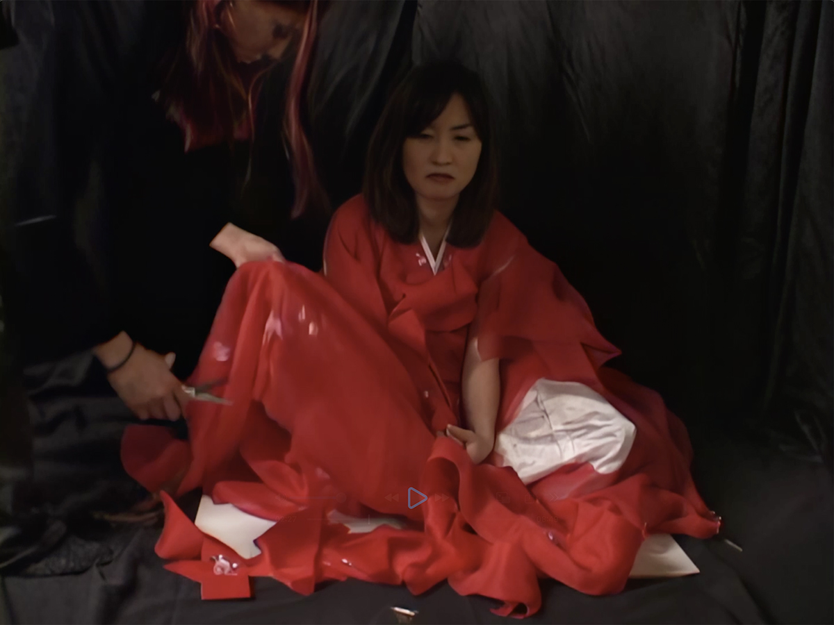 This performance is an homage to Yoko Ono’s Cut Piece, reinterpreted in an intimate setting with two invited close friends. It explores the transformation of Korean traditional identity as it shifts across time and place, from one generation to the next. As a young adult choosing a different path from the one I was raised in, the work reflects the tension between continuity and change. While identity can evolve, it cannot be entirely erased. This is symbolized by the act of hammering a Korean dress in an action that both destroys and retains, evoking a transition into a new cultural space while still bearing the weight of inherited tradition.