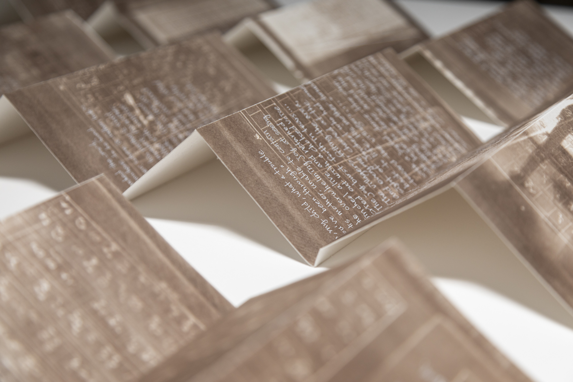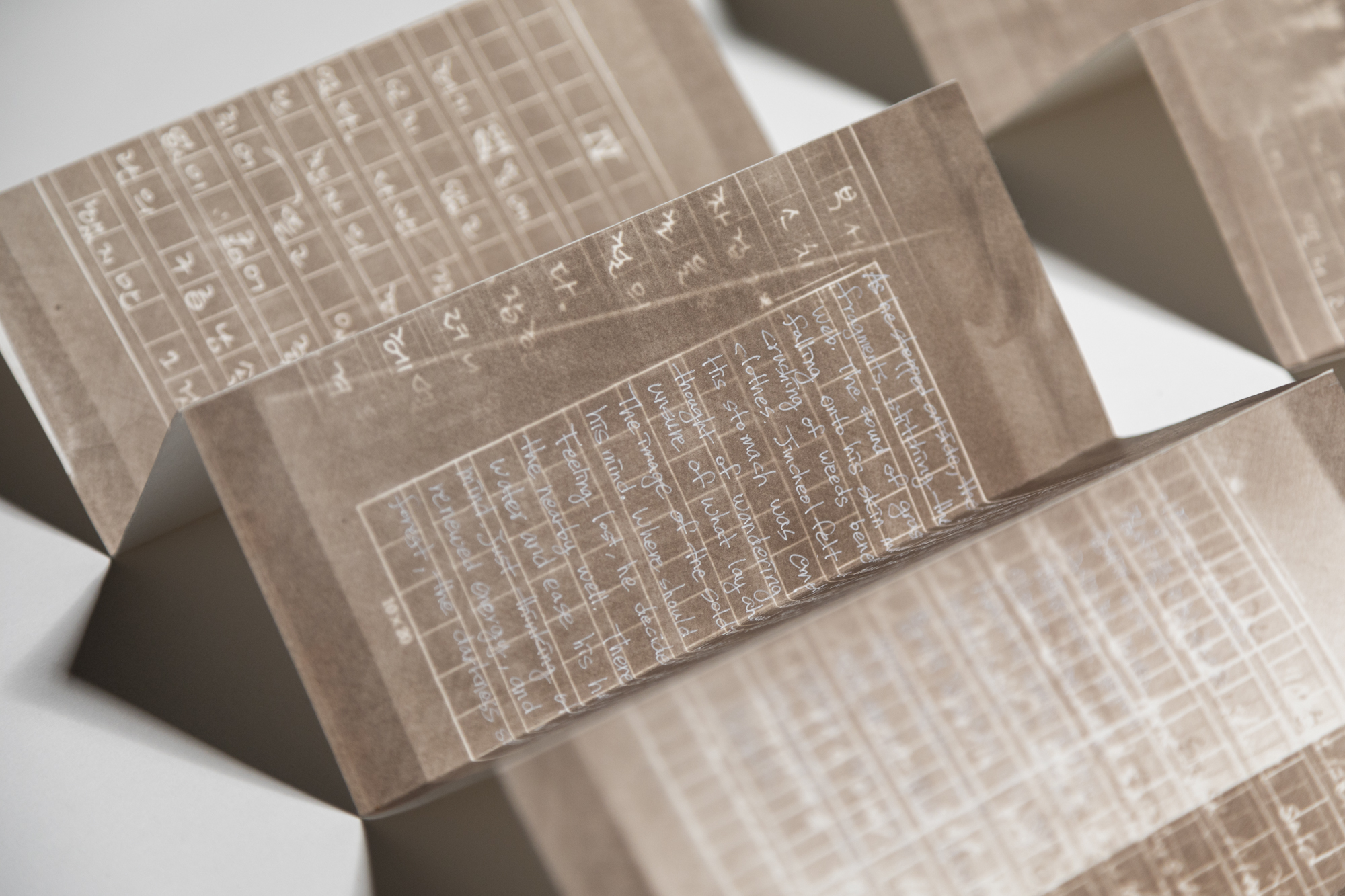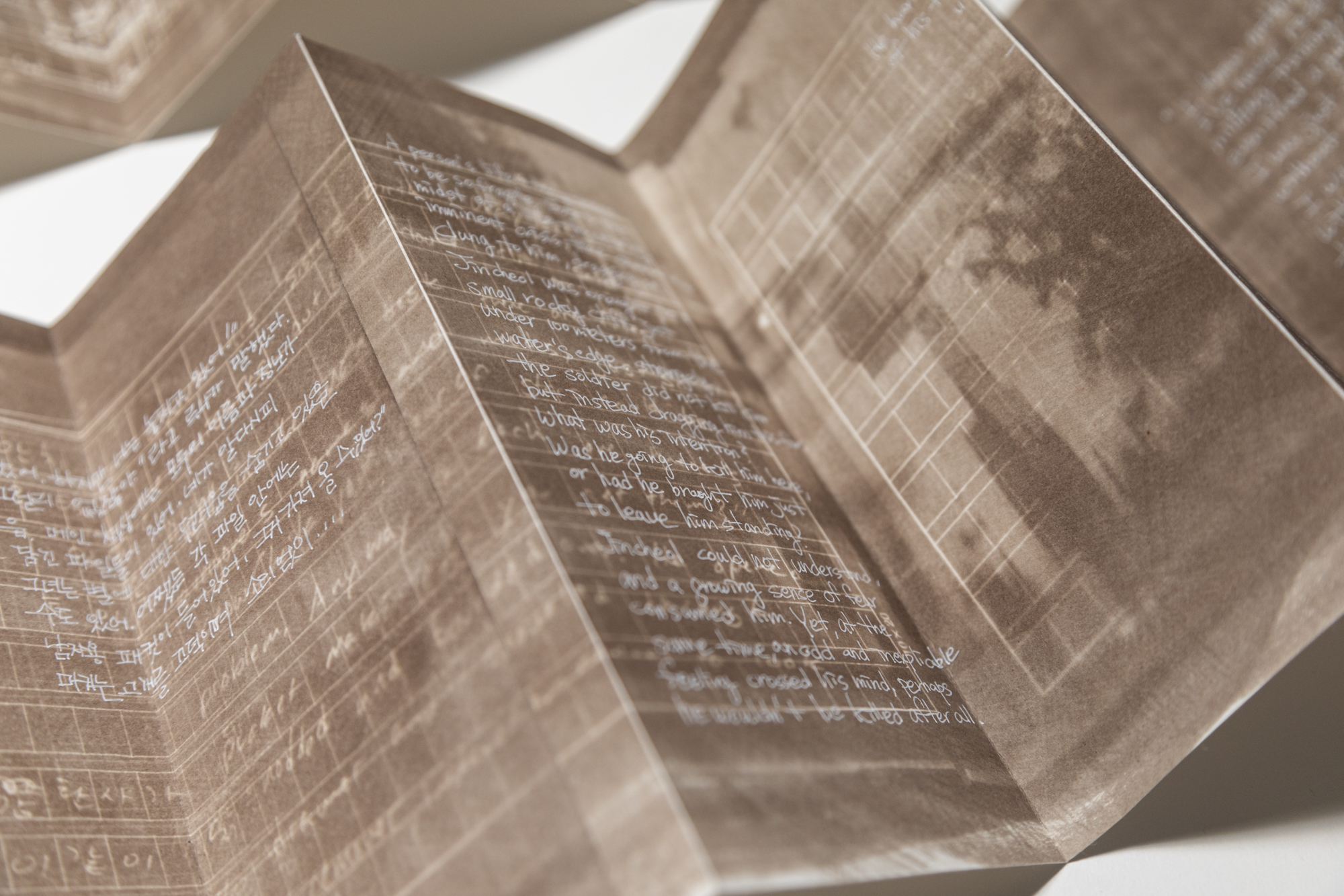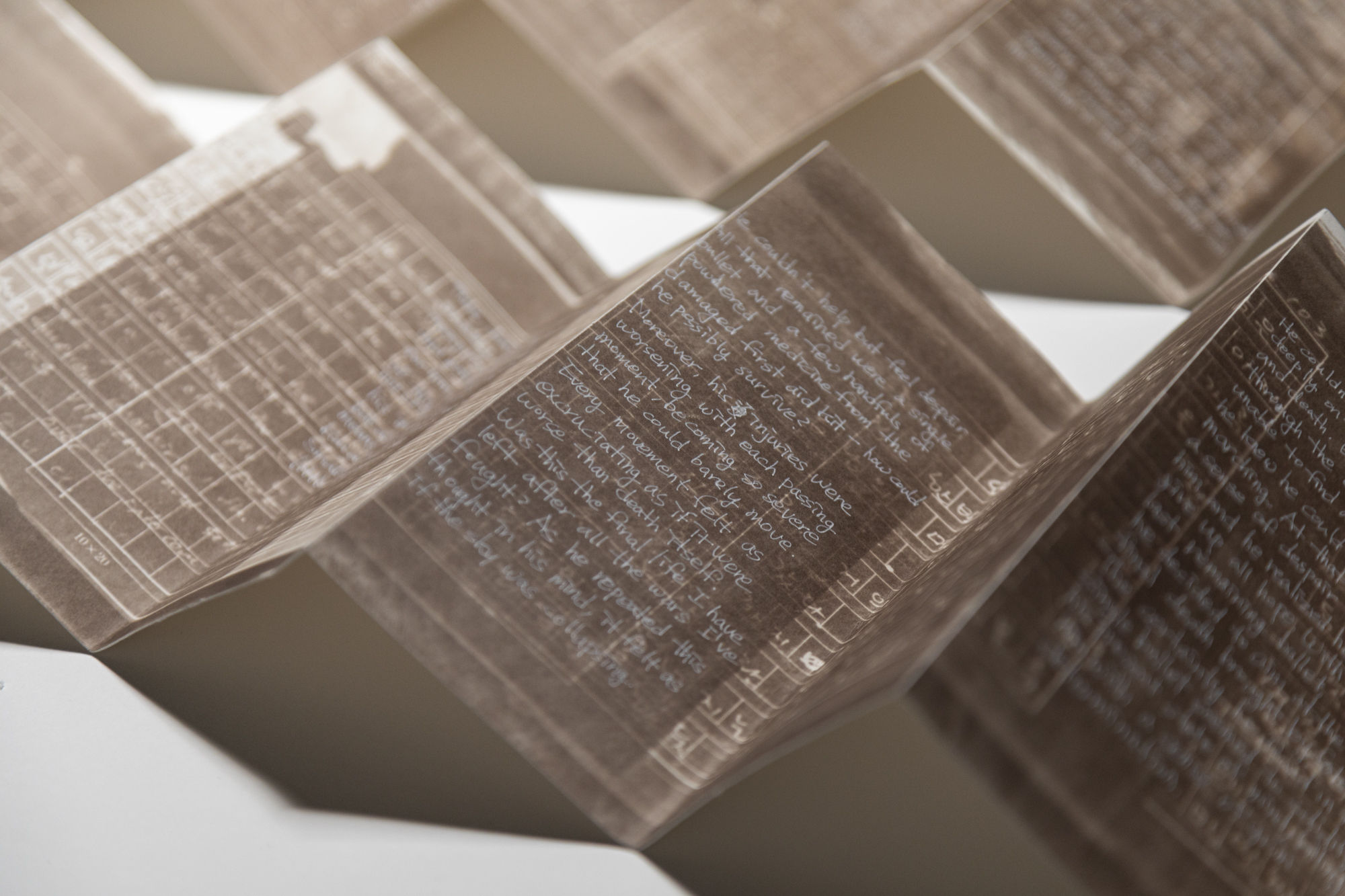A hand-made, three-volume accordion book contact printed in Van Dyke brown. An unpublished manuscript written by the artist’s father serves as a point of departure. The handwritten pages recount the story of a gravely wounded soldier struggling to return home to his mother. As he drifts in and out of a hallucinatory state, tensions build between the north and south and death becomes inevitable. This narrative is visually overlaid by a dreamscape of distorted imagery, conjuring elusive notions of home, extracted from a video work by the artist. Inscribed atop both layers is a fantastical, interstellar travelogue written by the artist’s young child. Together, these strata form a palimpsest of wandering, identity, and the unresolvable longing for return.