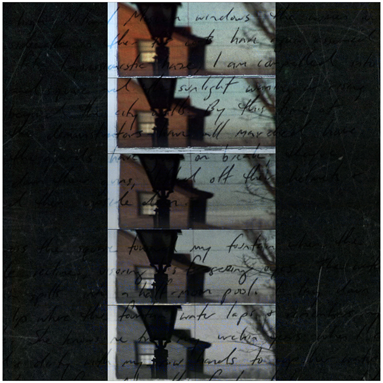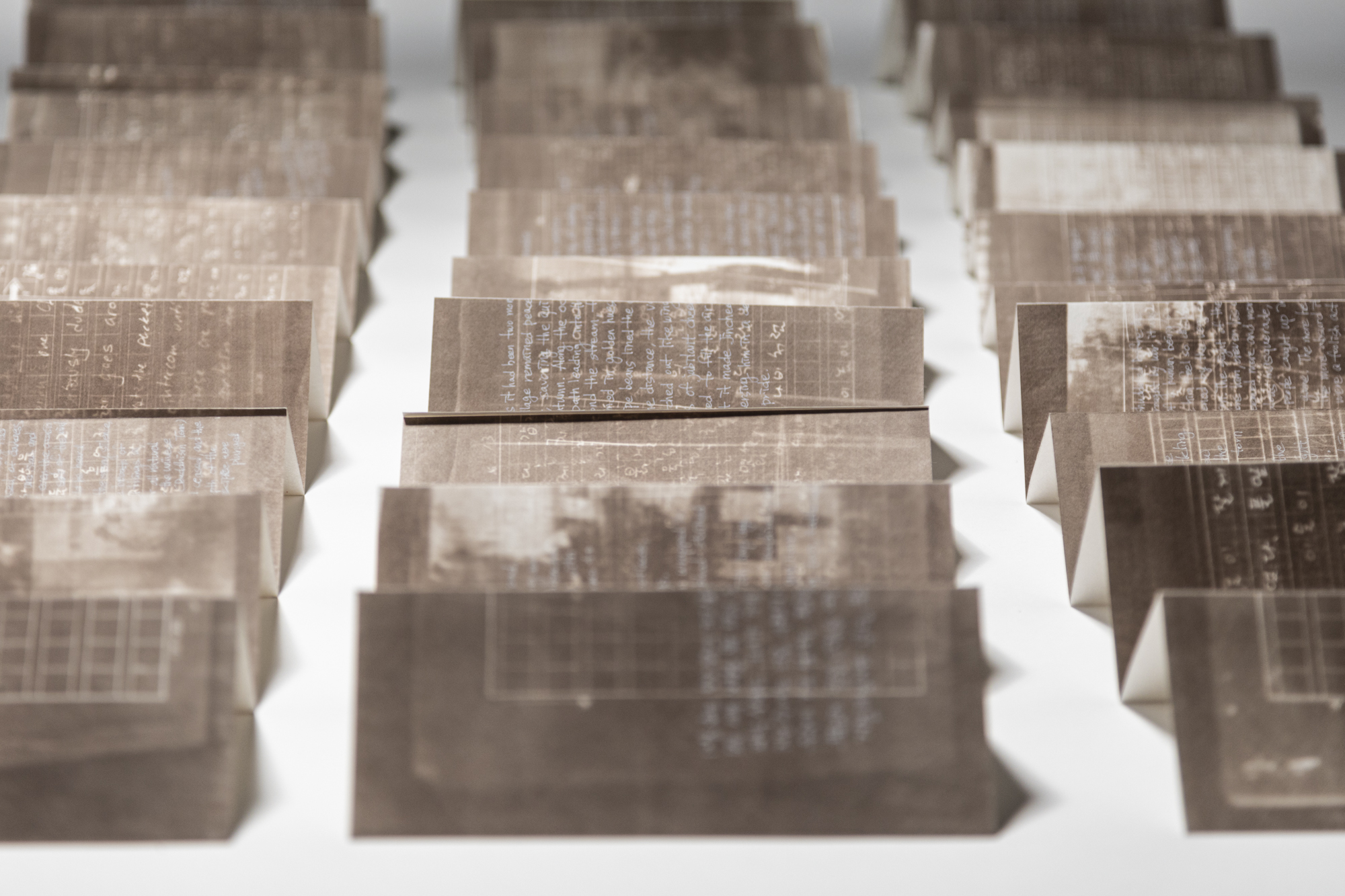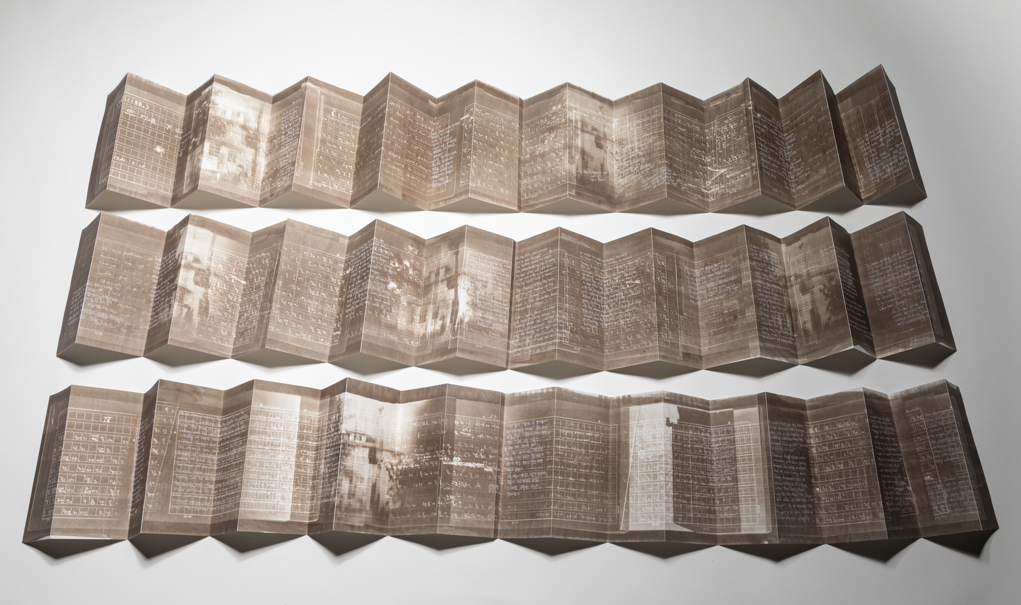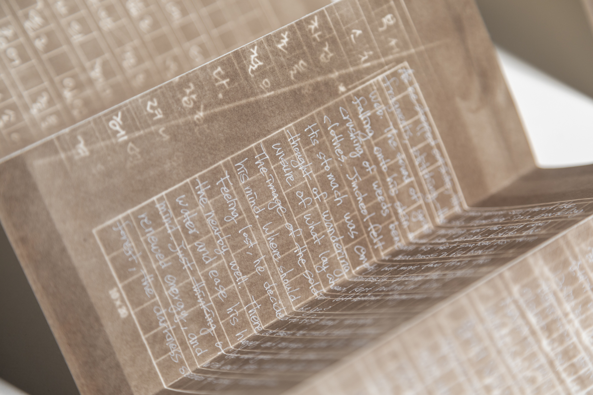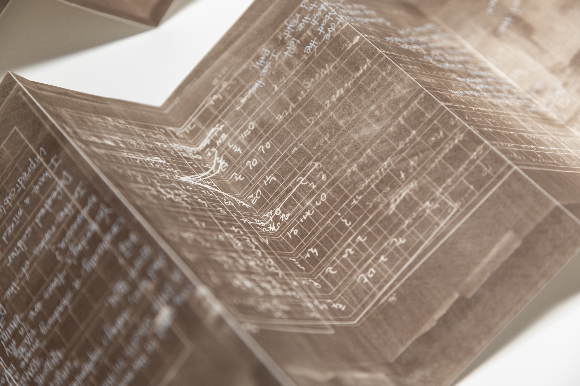 A hand-made, three-volume accordion book contact printed in Van Dyke brown. An unpublished manuscript written by the artist’s father serves as a point of departure. The handwritten pages recount the story of a gravely wounded soldier struggling to return home to his mother. As he drifts in and out of a hallucinatory state, tensions build between the north and south and death becomes inevitable. This narrative is visually overlaid by a dreamscape of distorted imagery, conjuring elusive notions of home, extracted from a video work by the artist. Inscribed atop both layers is a fantastical, interstellar travelogue written by the artist’s young child. Together, these strata form a palimpsest of wandering, identity, and the unresolvable longing for return.