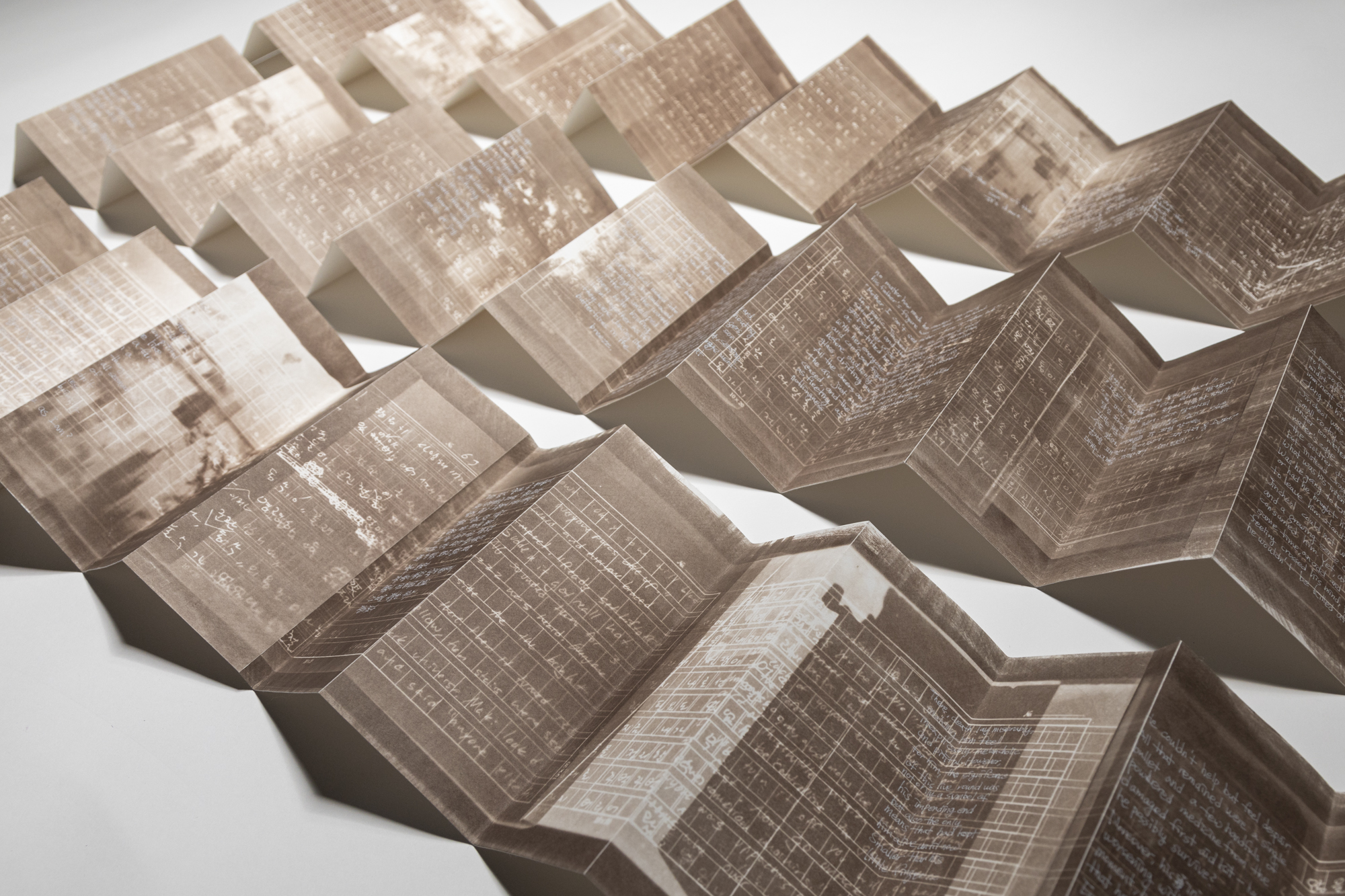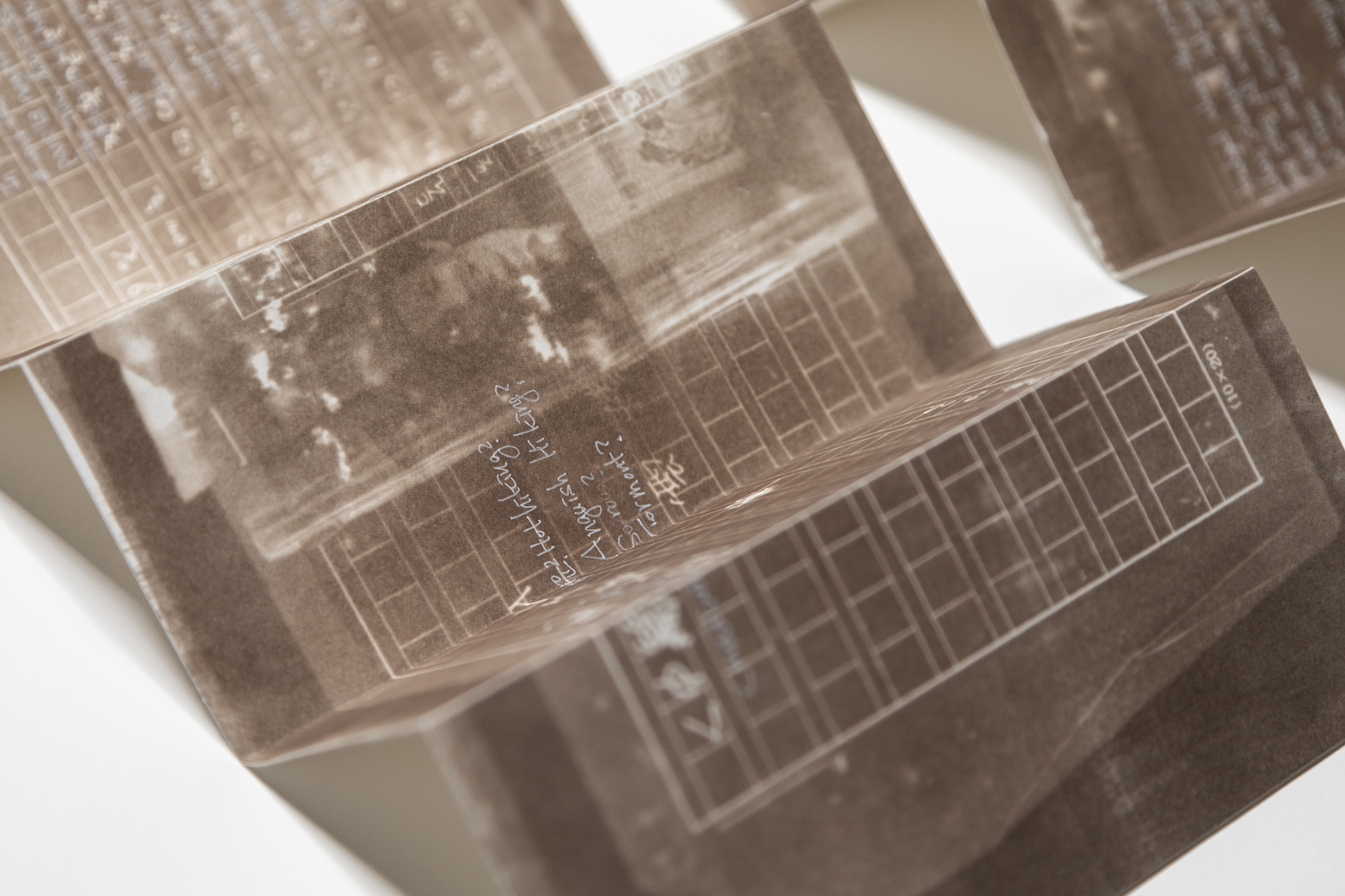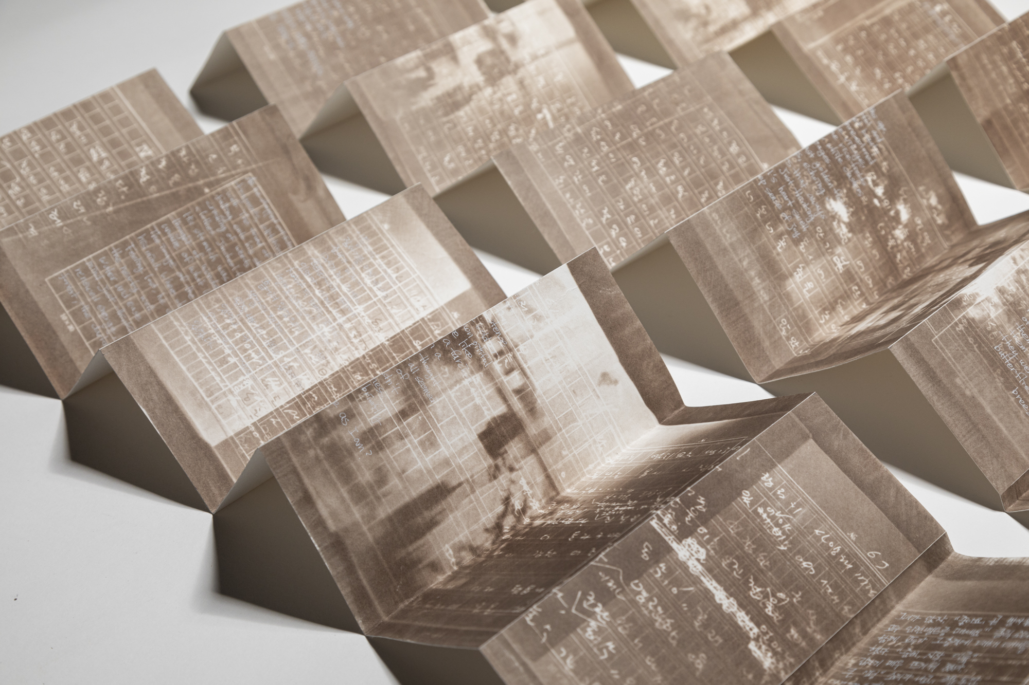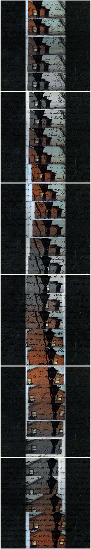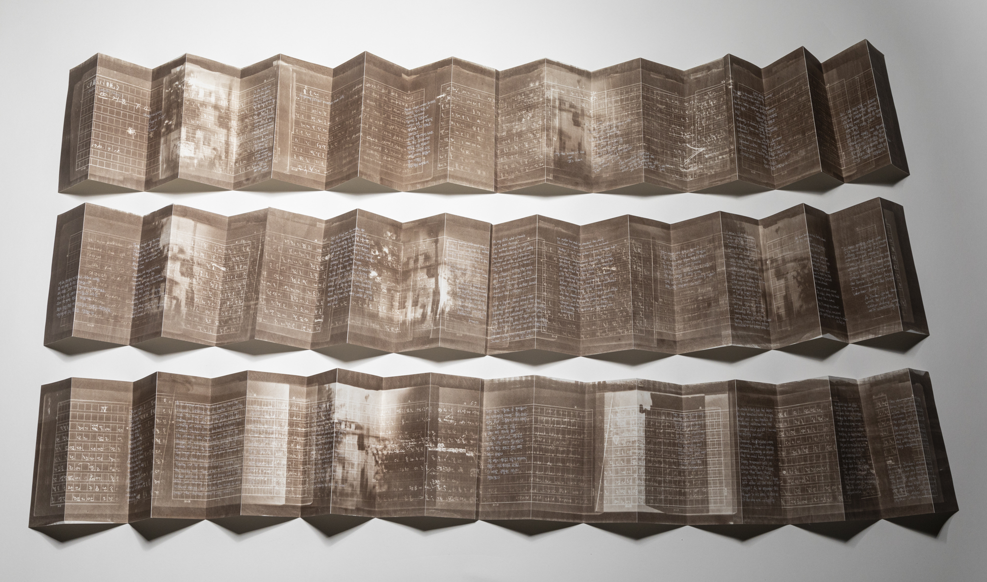 A hand-made, three-volume accordion book contact printed in Van Dyke brown. An unpublished manuscript written by the artist’s father serves as a point of departure. The handwritten pages recount the story of a gravely wounded soldier struggling to return home to his mother. As he drifts in and out of a hallucinatory state, tensions build between the north and south and death becomes inevitable. This narrative is visually overlaid by a dreamscape of distorted imagery, conjuring elusive notions of home, extracted from a video work by the artist. Inscribed atop both layers is a fantastical, interstellar travelogue written by the artist’s young child. Together, these strata form a palimpsest of wandering, identity, and the unresolvable longing for return.