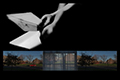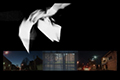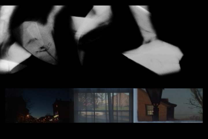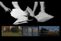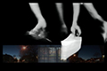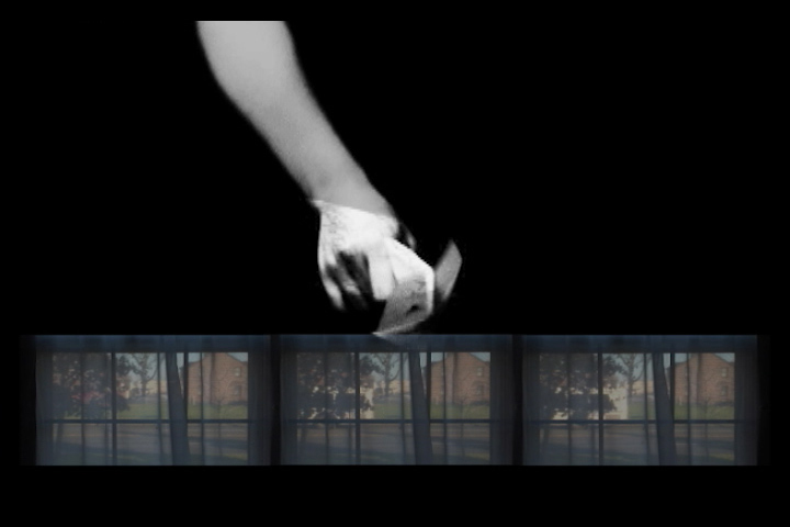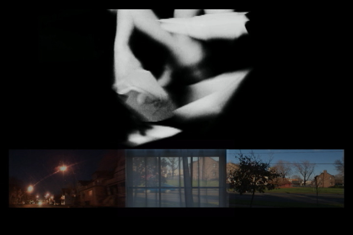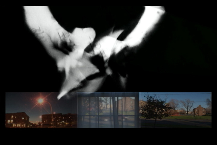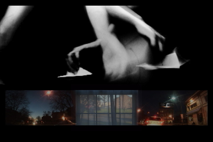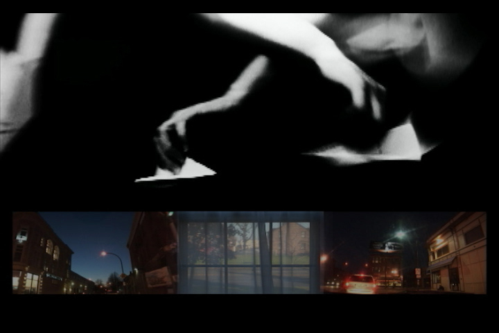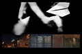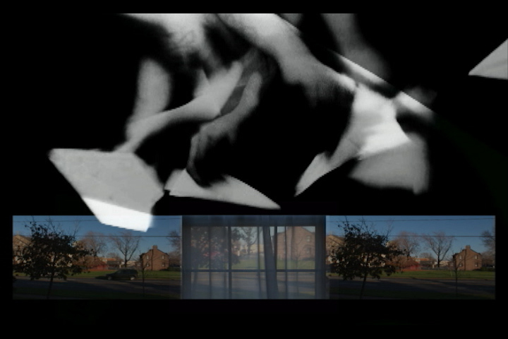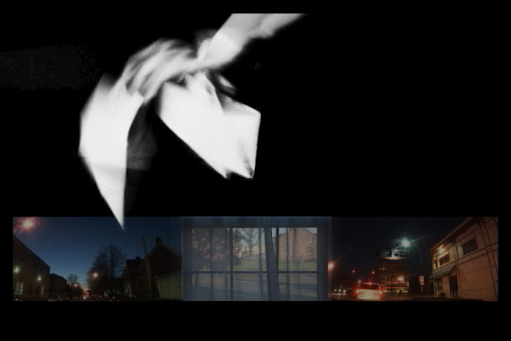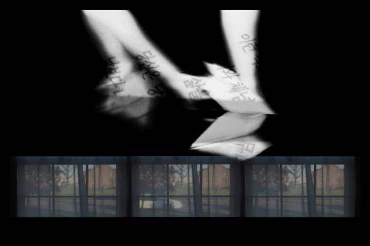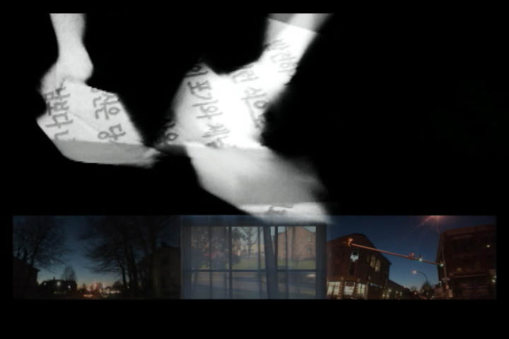 Drifting from Outside to Inside, Inside to Outside crafts an ambiguous, contradictory space. Direction, represented by the symbolic use of the paper plane, is characterized as an inherent human desire. However, the chaotic and confusing manipulation of the planes presents that desire as elusive if not ultimately unattainable. This piece is concerned with exploring these problematic, conflicting relationships. In another instance, the juxtaposition of Korean text with video of the American cityscape establishes the artist's position as being an insider and outsider to both localities.