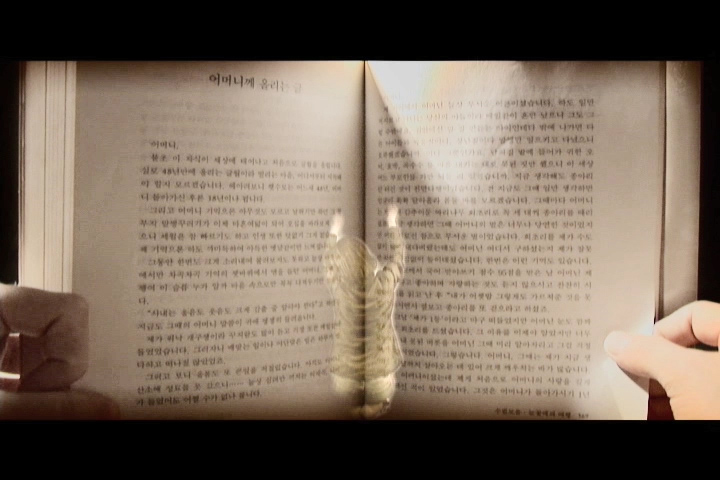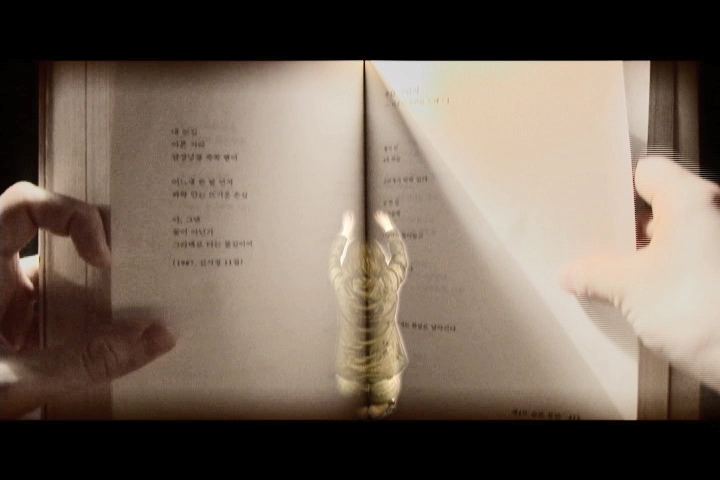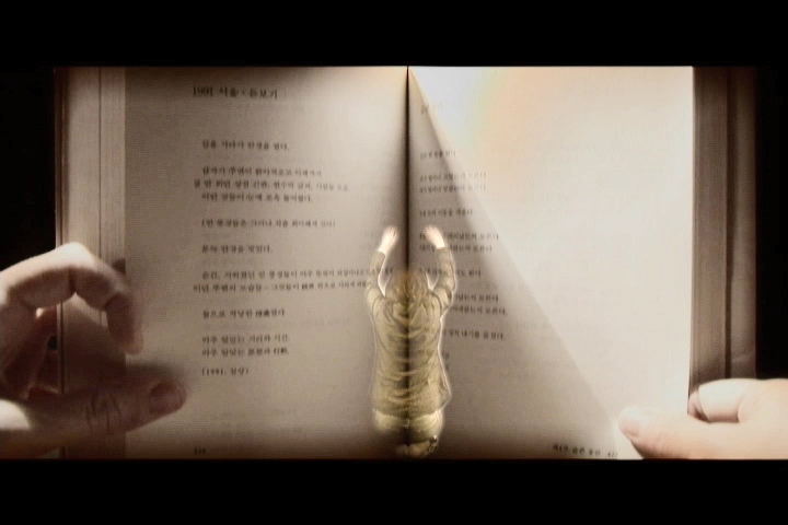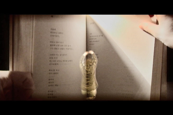 November 3rd explores the residual effects of the patriarchal Korean society. November 3rd marks the date of my father's death and thus the end of immediate paternal authority. A book of poetry authored by my father serves as both the structure for the piece as well as a stand-in for his presence. The book references not only his physical absence, but also the persistent presence of his thoughts, values, teaching and authority. Woven into the pages of the text is a video documentation of a traditional Korean punishment. Recalling this childhood ritual has new significance as I, in my father's absence, metaphorically punish myself for straying from his traditional values after his death. This punishment is interspersed with a second video where I am costumed in a Han-Bok, a Korean ceremonial gown, explores similar themes of enforced obedience. The performance is built around a destructive act. Cutting the Han-Bok while it is being worn, the erasure of Korean tradition from the physical body, acknowledges a failure to adhere to the rules of cultural performance.