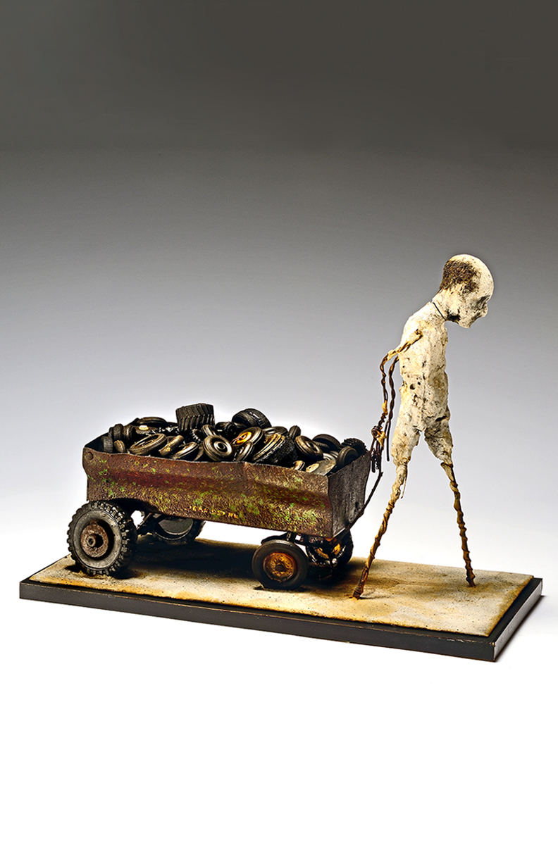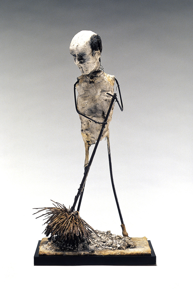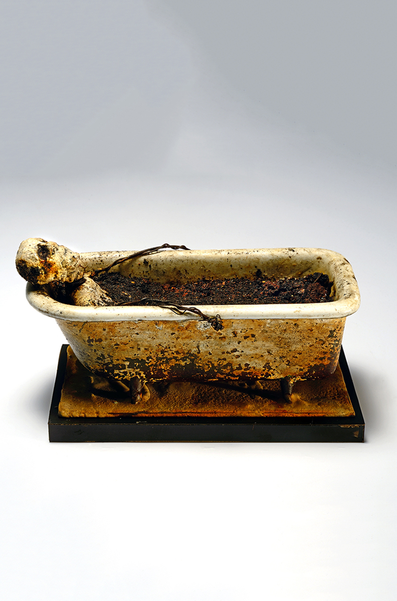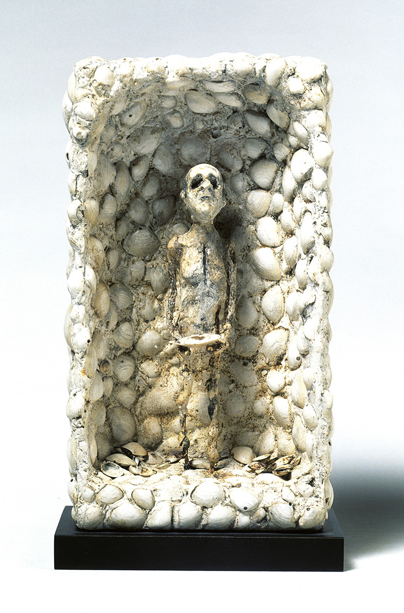 (Materials: Cast and sandblasted plaster, wax, and wire, hair graphite - and found objects if applicable)